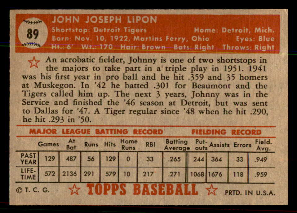 1952 Topps Baseball #089 Johnny Lipon Tigers EX+/EX-MT 544164