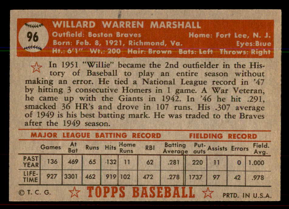 1952 Topps Baseball #096 Willard Marshall Braves EX-MT 544171