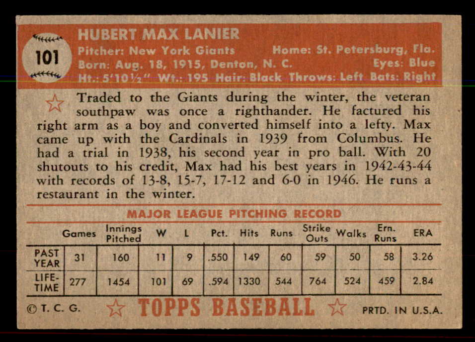 1952 Topps Baseball #101 Max Lanier Giants EX+/EX-MT 544176