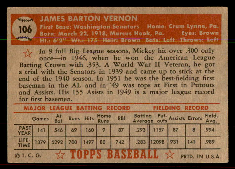 1952 Topps Baseball #106 Mickey Vernon Senators EX+/EX-MT 544181