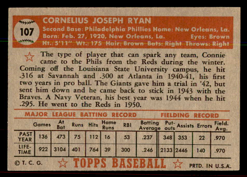 1952 Topps Baseball #107 Connie Ryan Phillies EX-MT 544182