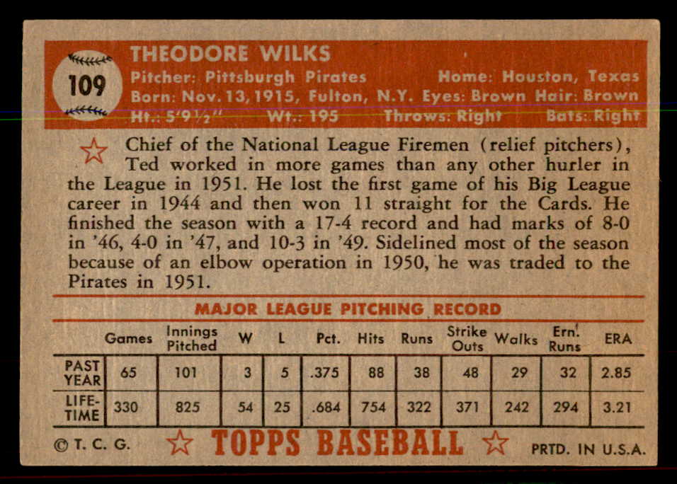 1952 Topps Baseball #109 Ted Wilks Pirates EX+/EX-MT 544184