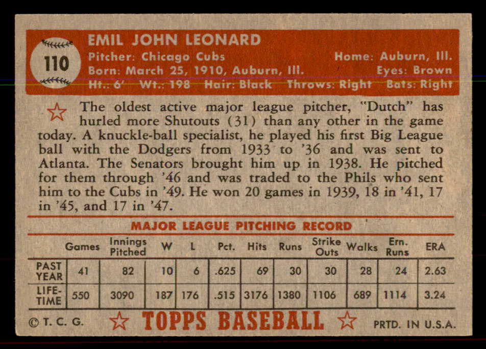 1952 Topps Baseball #110 Dutch Leonard Cubs EX-MT 544185