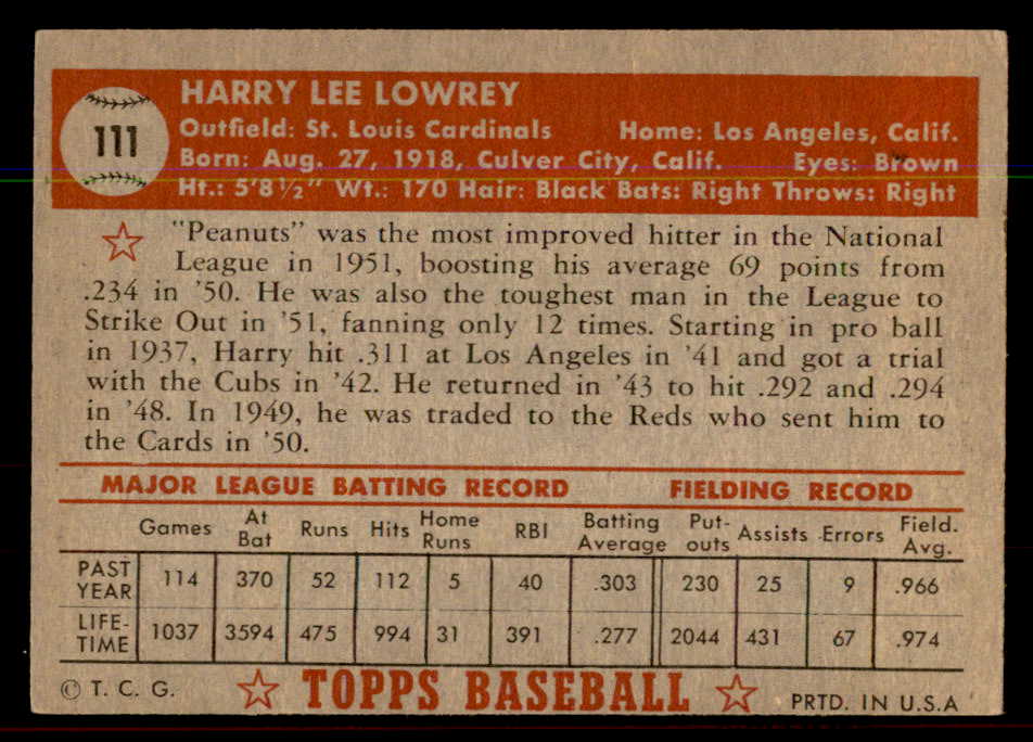 1952 Topps Baseball #111 Peanuts Lowrey Cardinals VG-EX 544186