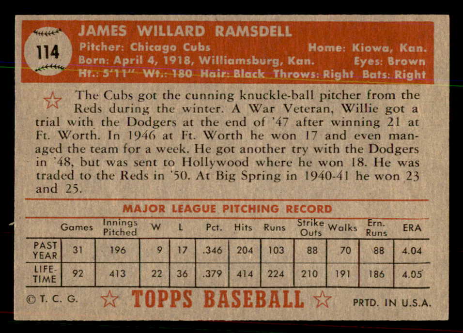1952 Topps Baseball #114 Willard Ramsdell Cubs EX-MT 544189