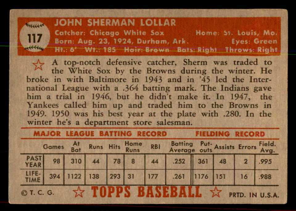1952 Topps Baseball #117 Sherm Lollar White Sox EX 544192
