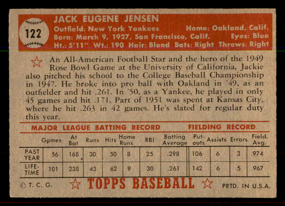 1952 Topps Baseball #122 Jackie Jensen Yankees EX-MT 544197