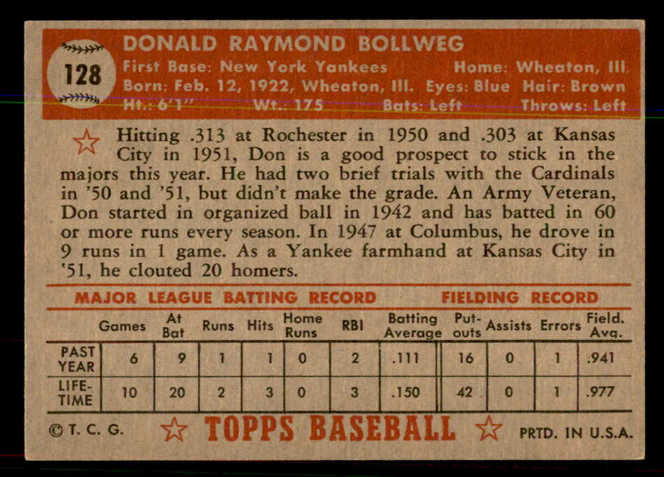 1952 Topps Baseball #128 Don Bollweg Yankees EX-MT 544203