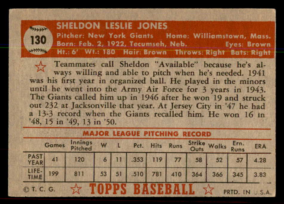 1952 Topps Baseball #130 Sheldon Jones Giants EX-MT 544205