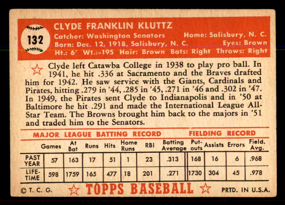 1952 Topps Baseball #132 Clyde Kluttz Senators VG-EX 544207