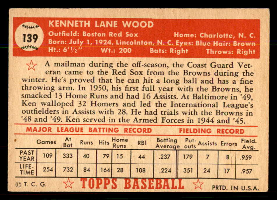 1952 Topps Baseball #139 Ken Wood Red Sox VG-EX 544214
