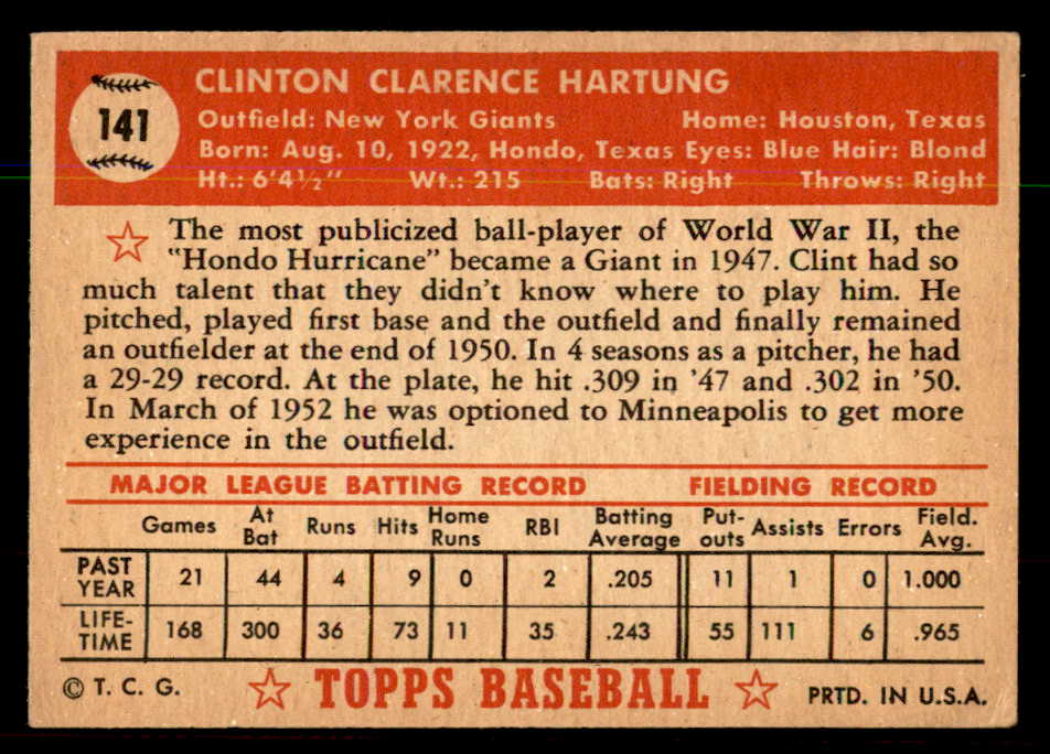 1952 Topps Baseball #141 Clint Hartung Giants EX+/EX-MT 544216