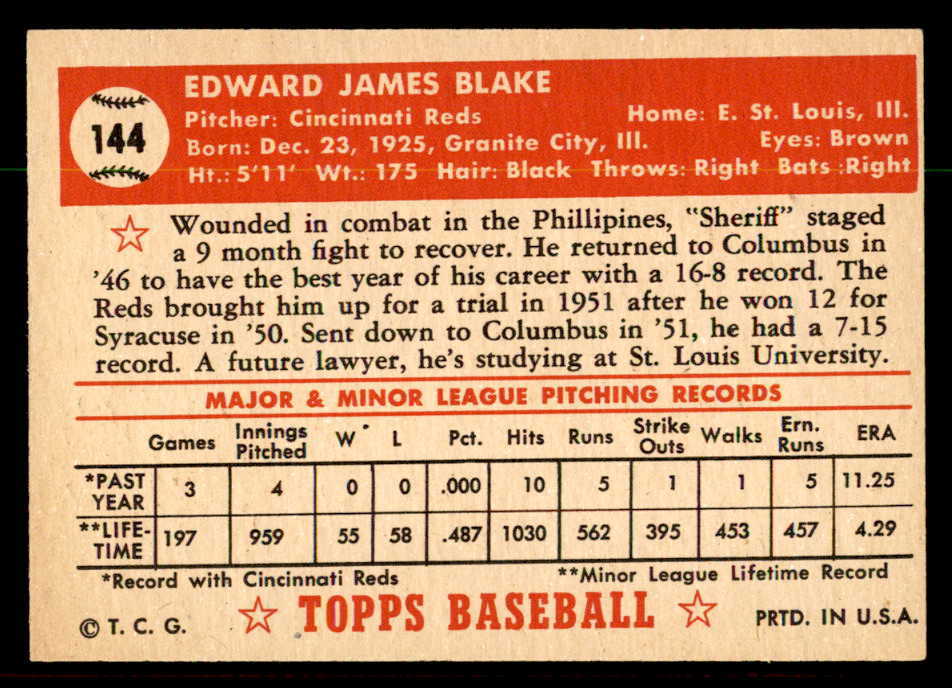 1952 Topps Baseball #144 Ed Blake Reds VG-EX 544219