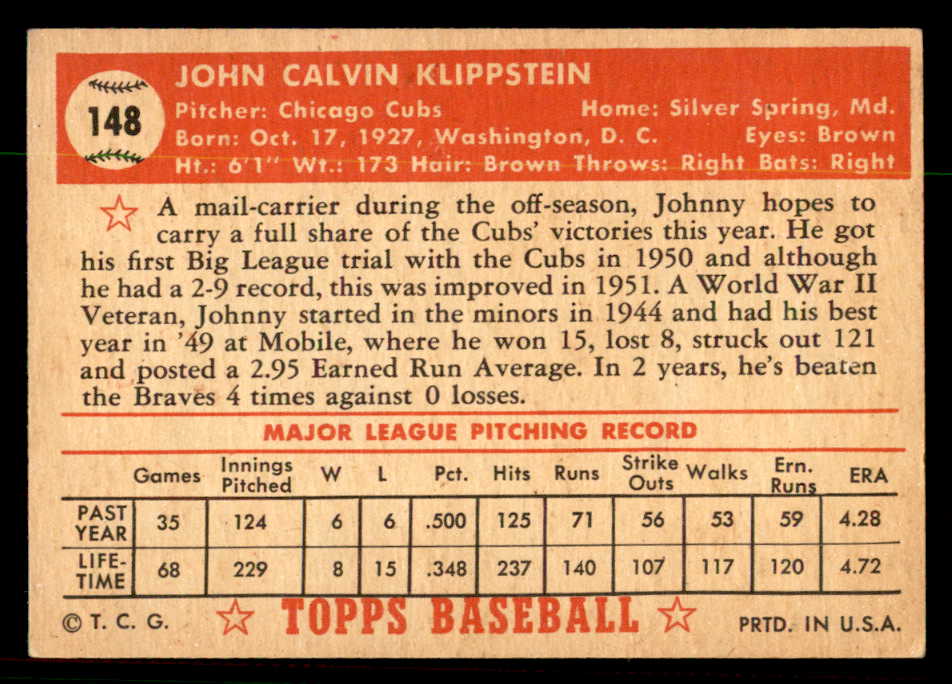 1952 Topps Baseball #148 Johnny Klippstein Cubs EX+/EX-MT 544223