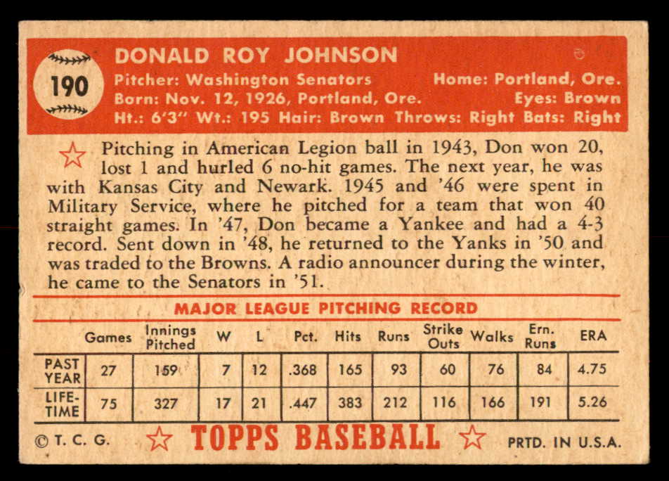1952 Topps Baseball #190 Don Johnson Senators VG-EX 544264