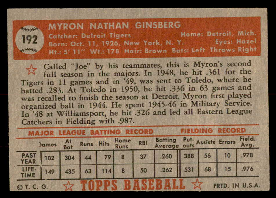 1952 Topps Baseball #192 Joe Ginsberg Tigers EX-MT 544265