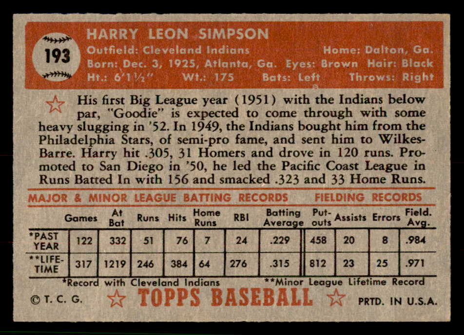 1952 Topps Baseball #193 Harry Simpson Indians EX-MT 544266