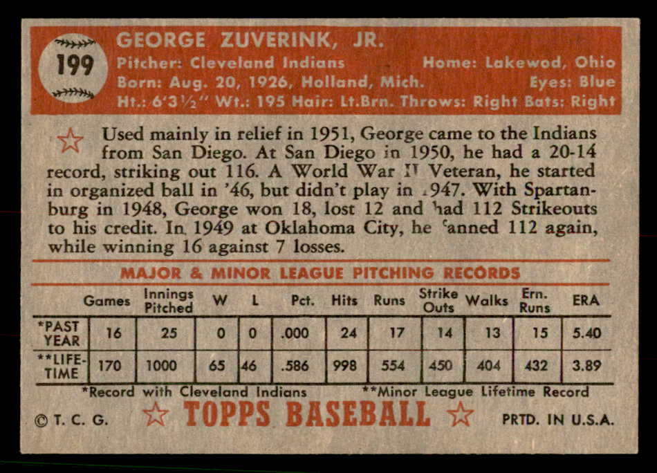 1952 Topps Baseball #199 George Zuverink Indians EX+/EX-MT 544271