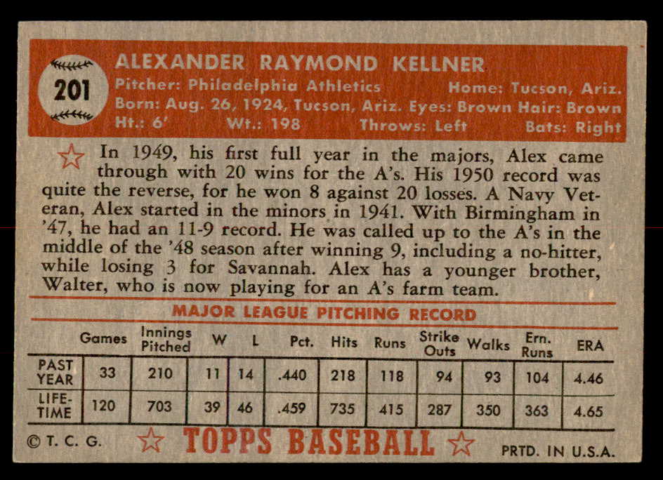 1952 Topps Baseball #201 Alex Kellner A's EX-MT 544273