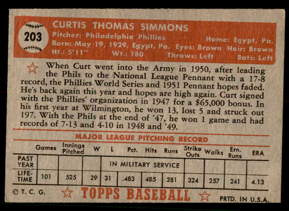 1952 Topps Baseball #203 Curt Simmons Phillies EX+/EX-MT 544275
