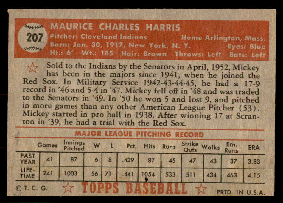 1952 Topps Baseball #207 Mickey Harris Indians EX-MT 544279