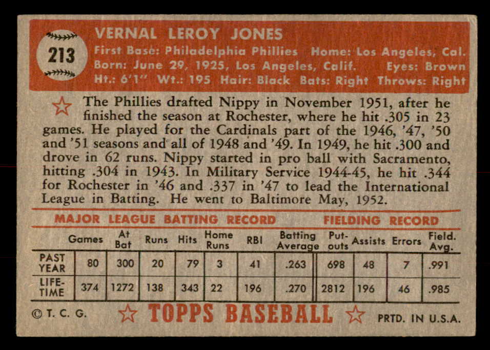 1952 Topps Baseball #213 Nippy Jones Phillies VG-EX 544285