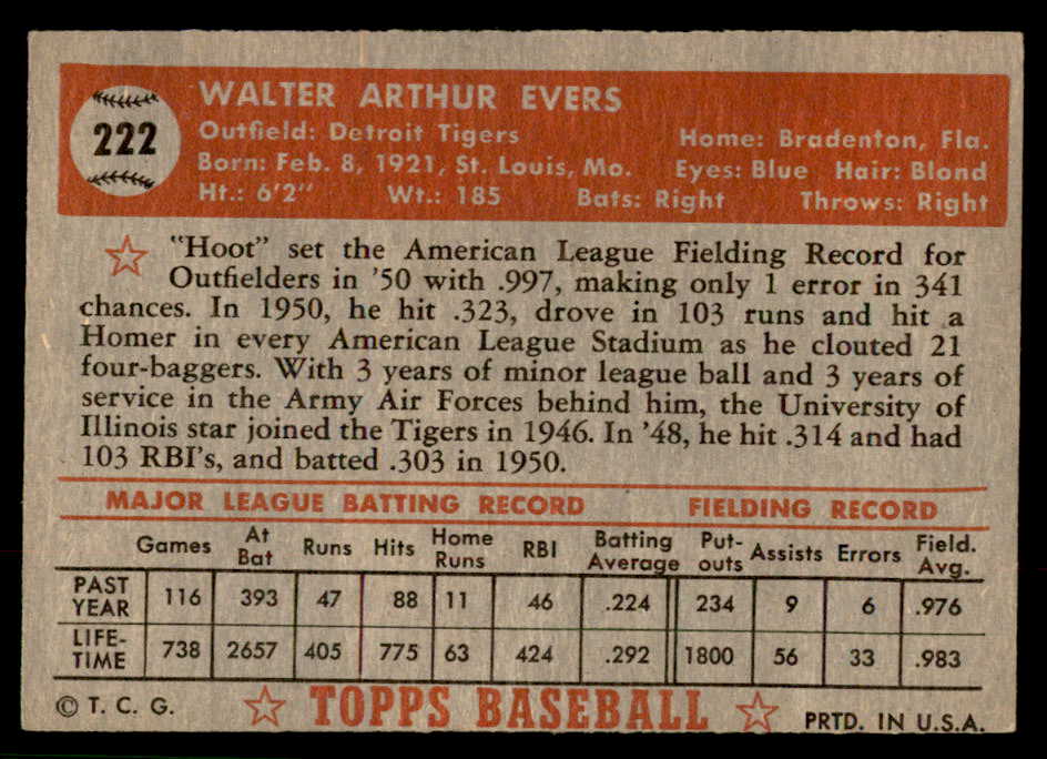 1952 Topps Baseball #222 Hoot Evers Tigers EX-MT 544293