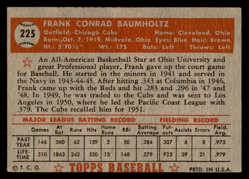 1952 Topps Baseball #225 Frank Baumholtz Cubs EX-MT 544296