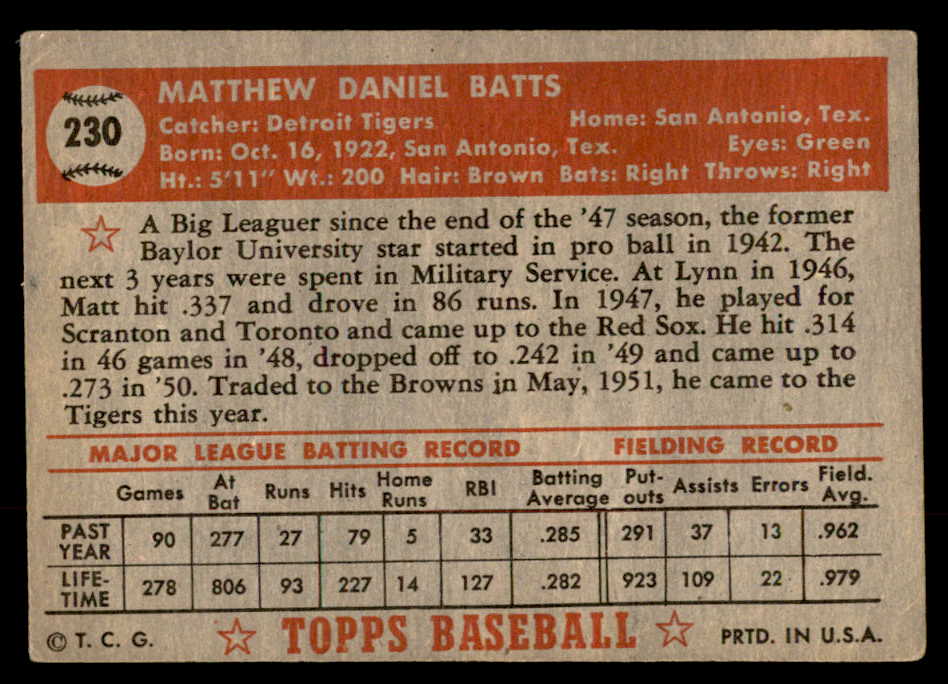 1952 Topps Baseball #230 Matt Batts Tigers VG-EX 544300