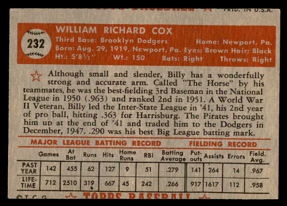 1952 Topps Baseball #232 Billy Cox Dodgers EX 544302