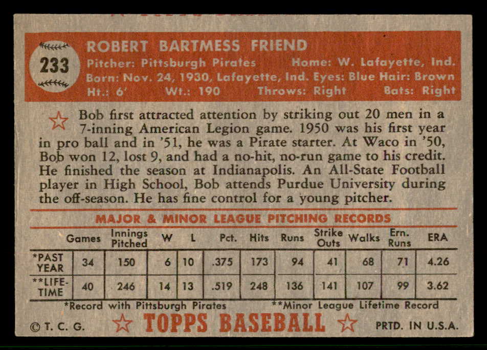 1952 Topps Baseball #233 Bob Friend Pirates EX-MT 544303