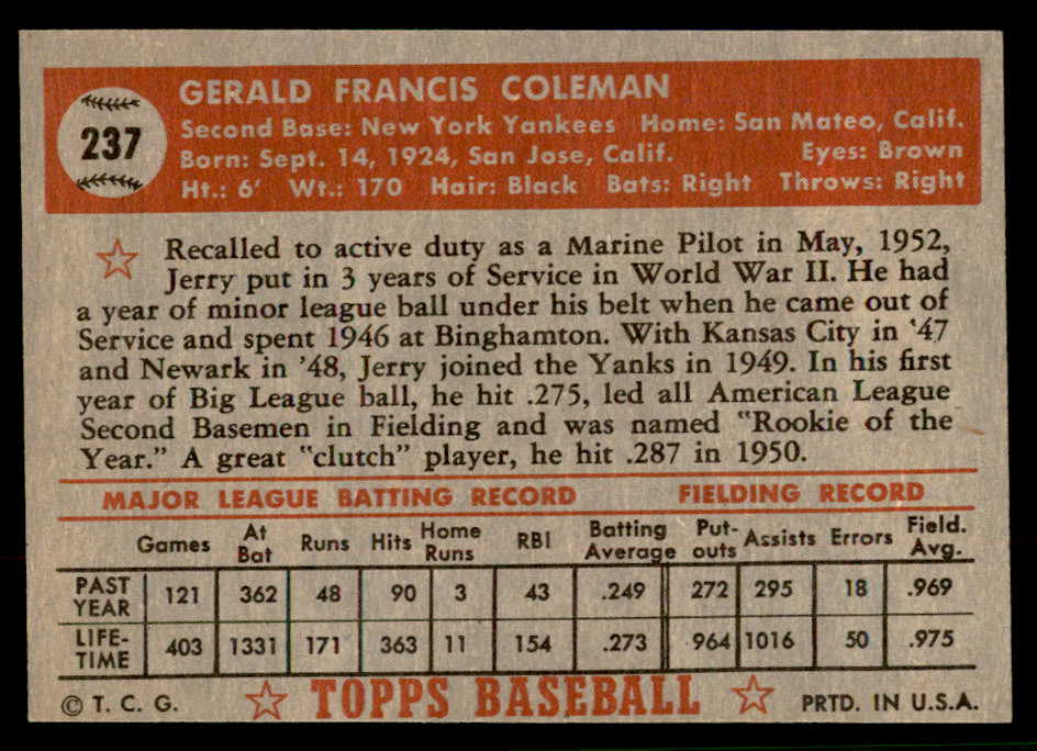 1952 Topps Baseball #237 Jerry Coleman Yankees EX 544307