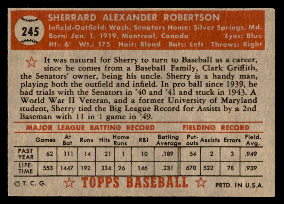 1952 Topps Baseball #245 Sherry Robertson Senators EX-MT 544315