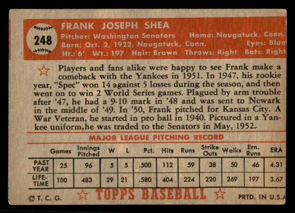 1952 Topps Baseball #248 Frank Shea Yankees EX 544318