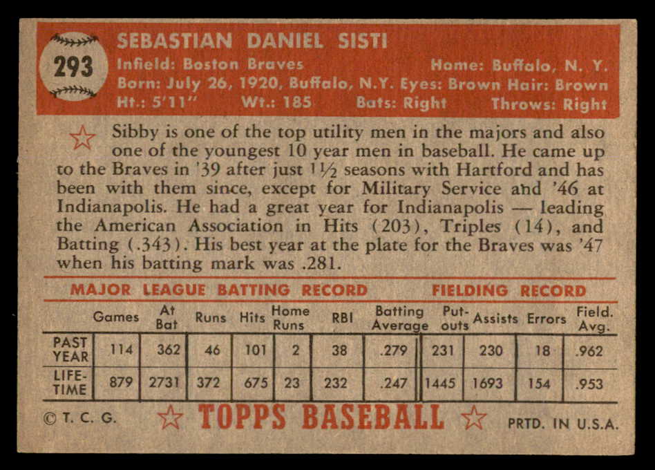 1952 Topps Baseball #293 Sibby Sisti Braves EX-MT 544358