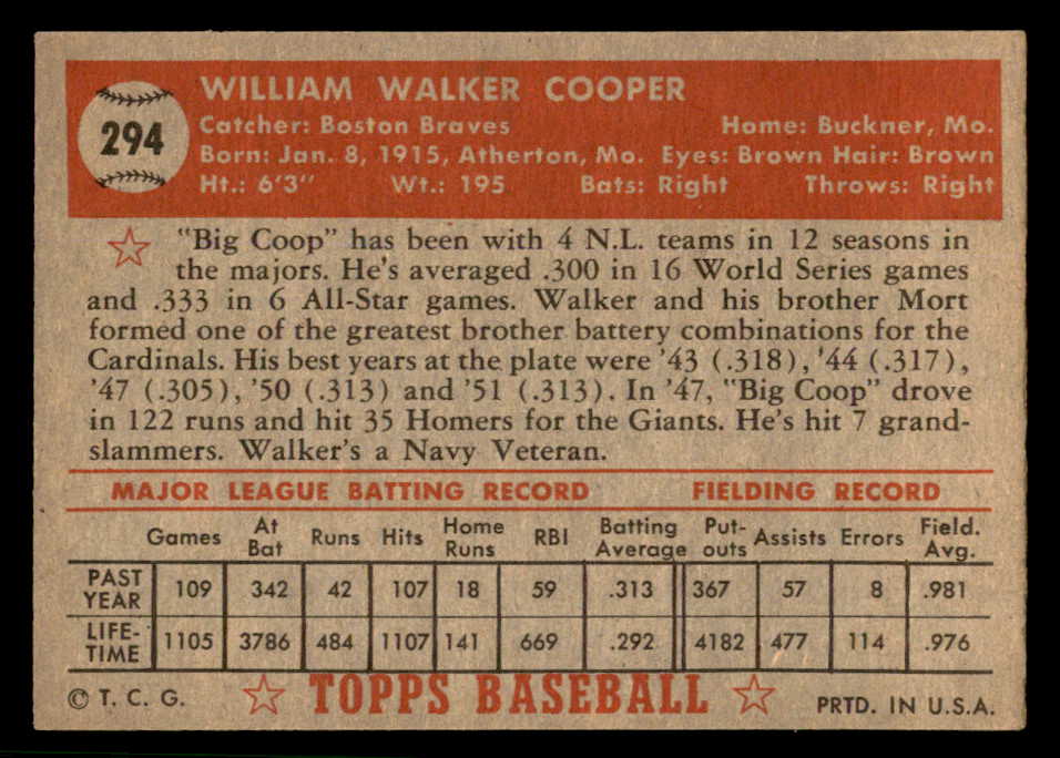 1952 Topps Baseball #294 Walker Cooper Braves EX-MT 544359