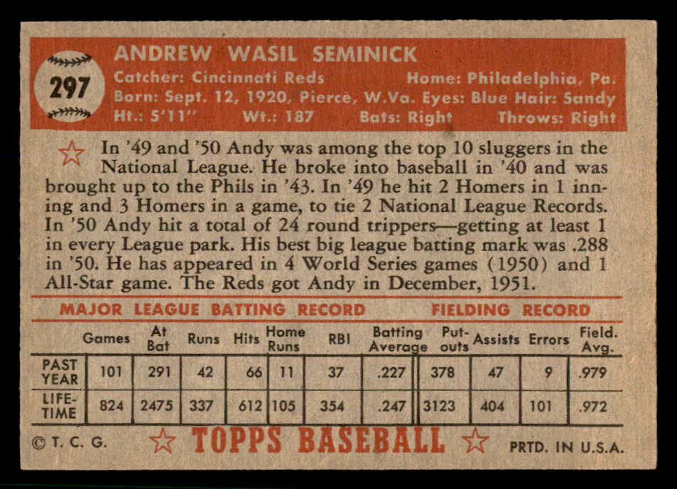 1952 Topps Baseball #297 Andy Seminick Reds EX-MT 544362