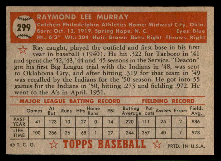 1952 Topps Baseball #299 Ray Murray A's EX-MT 544364