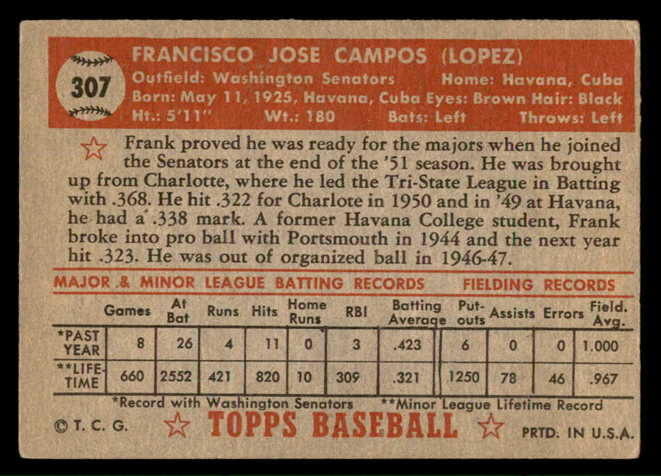 1952 Topps Baseball #307 Frank Campos Senators VG-EX 544372