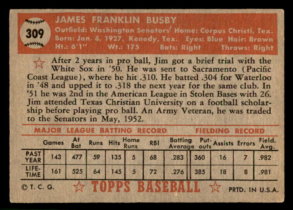 1952 Topps Baseball #309 Jim Busby Senators EX+/EX-MT 544374