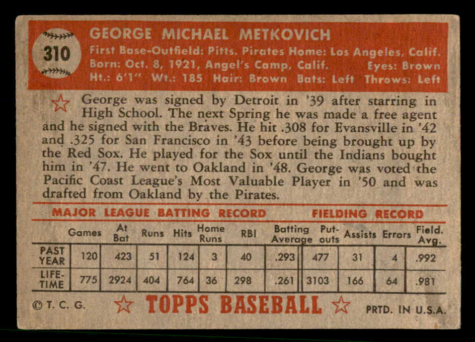 1952 Topps Baseball #310 George Metkovich Pirates EX+/EX-MT 544375