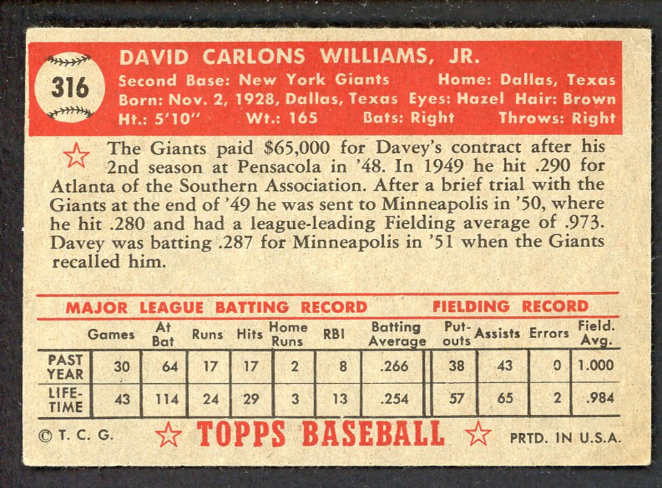 1952 Topps Baseball #316 Davey Williams Giants EX+/EX-MT 546912