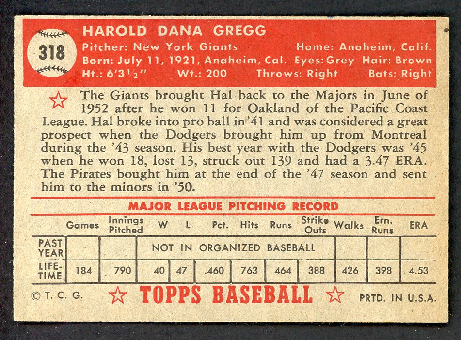 1952 Topps Baseball #318 Hal Gregg Giants EX-MT 546916
