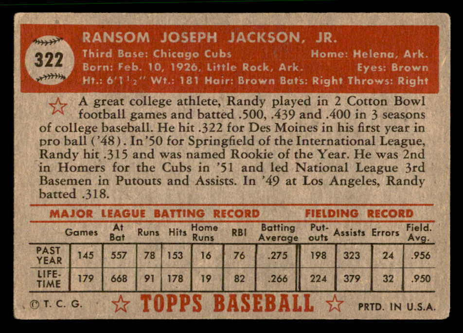 1952 Topps Baseball #322 Randy Jackson Cubs VG 544378