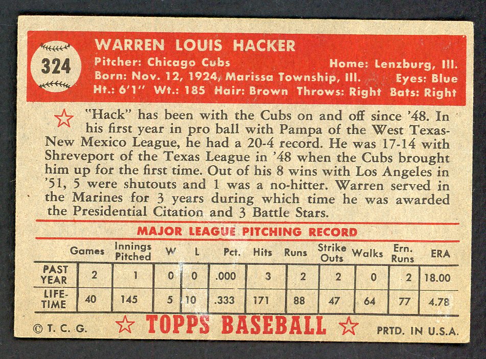 1952 Topps Baseball #324 Warren Hacker Cubs EX+/EX-MT 546923