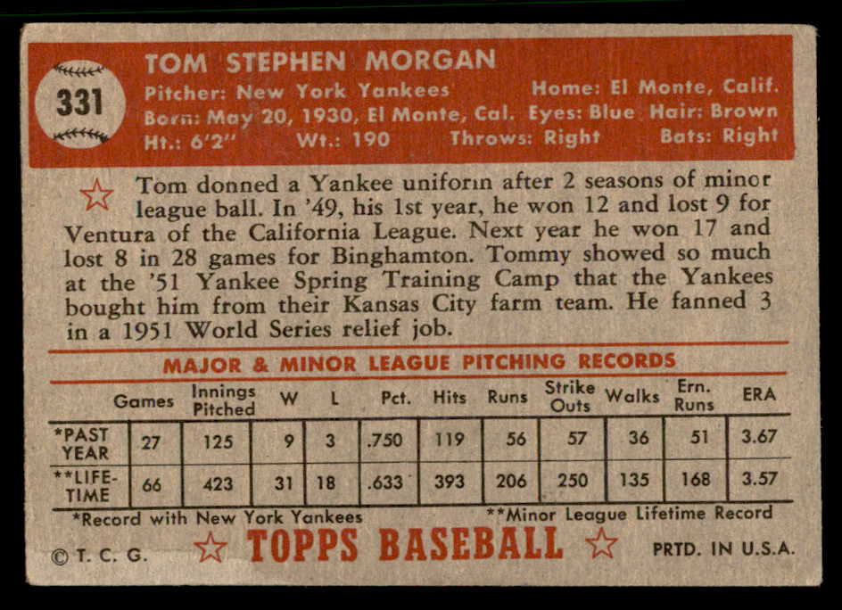 1952 Topps Baseball #331 Tom Morgan Yankees VG-EX 544379