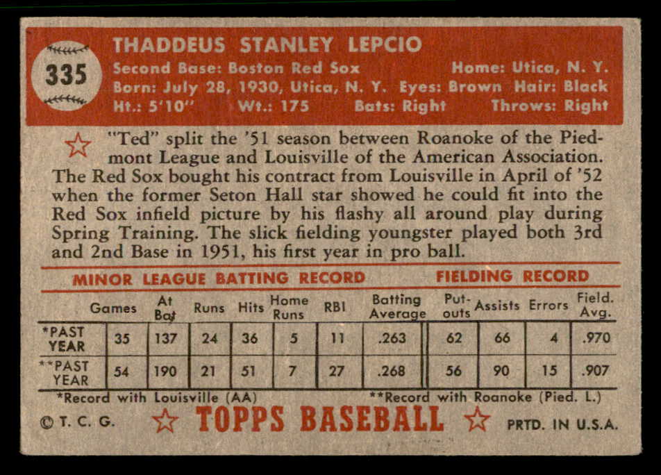 1952 Topps Baseball #335 Ted Lepcio Red Sox VG-EX 544380