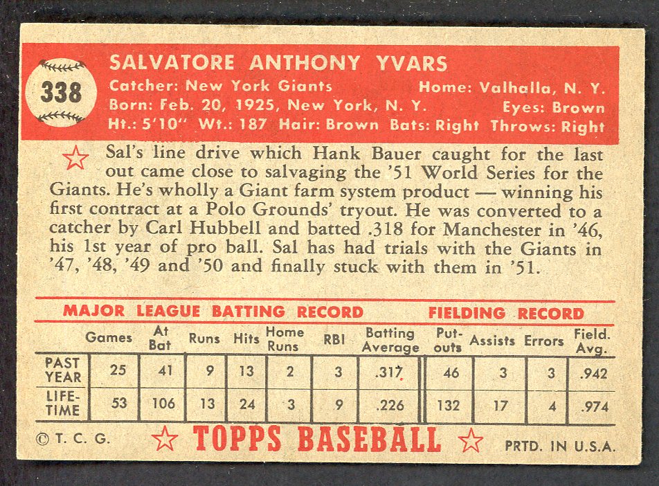 1952 Topps Baseball #338 Sal Yvars Giants EX+/EX-MT 546928