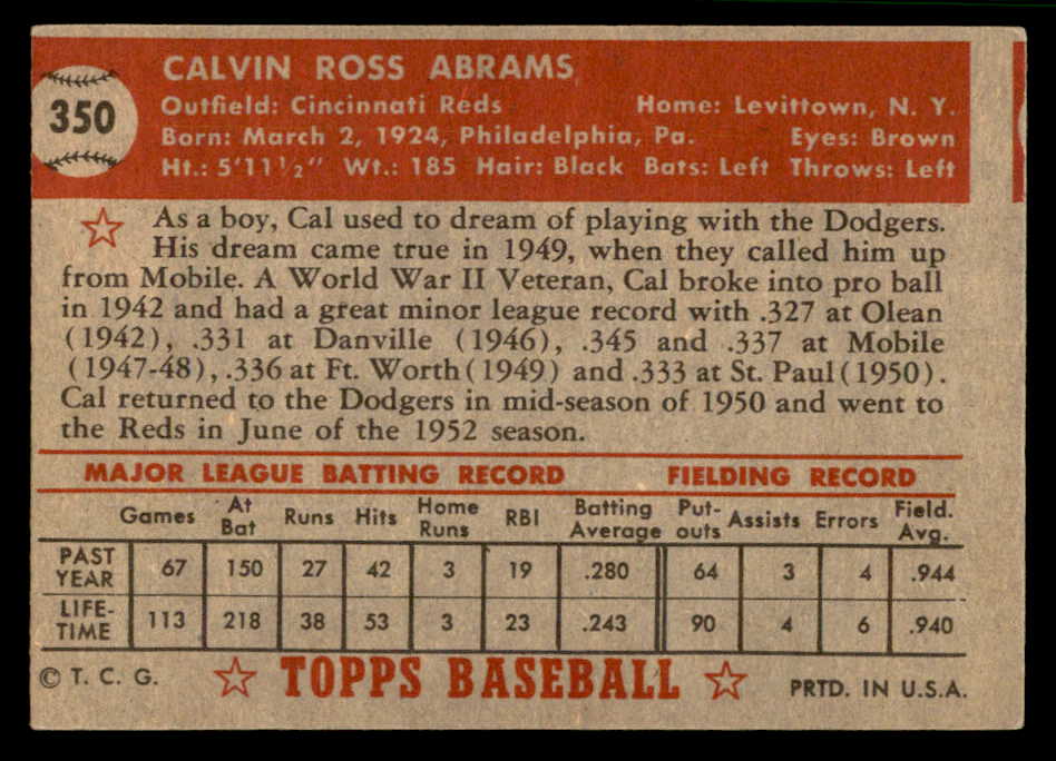 1952 Topps Baseball #350 Cal Abrams Reds VG 544387