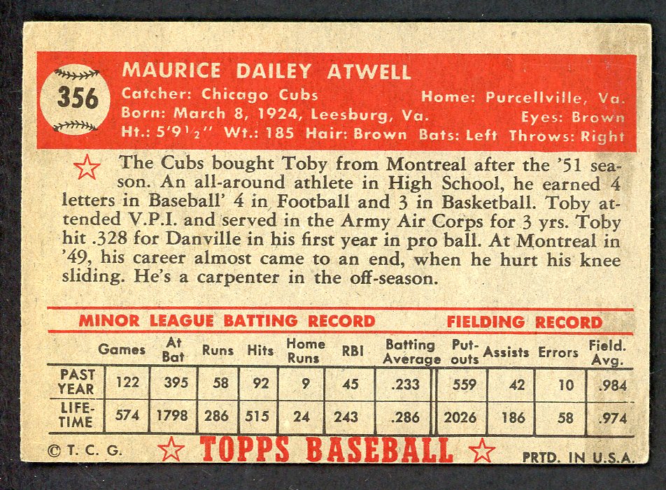 1952 Topps Baseball #356 Toby Atwell Cubs EX+/EX-MT 546922